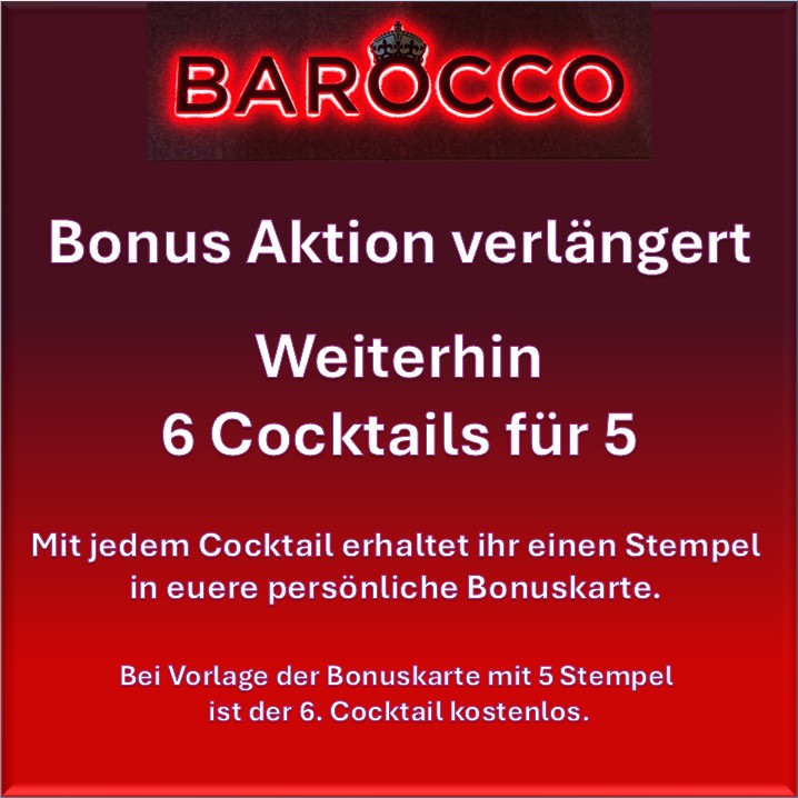 In unserem Barocco München können Sie eine einzigartigen Atmosphäre geniessen und sich entspannt mit Freunden treffen. von 19:00 Uhr bis 01:00 Uhr in der Früh sorgt das Team für ihr Wohlbefinden.
